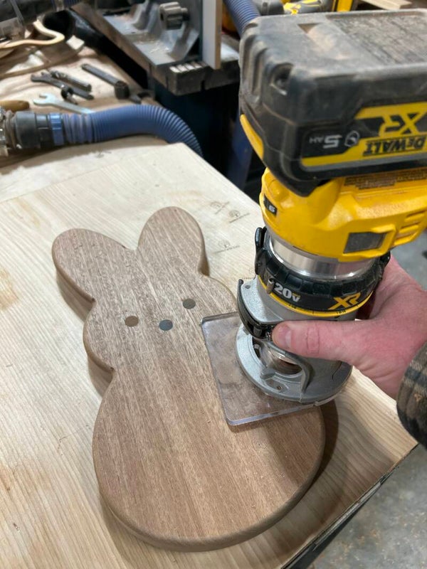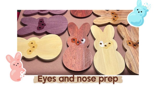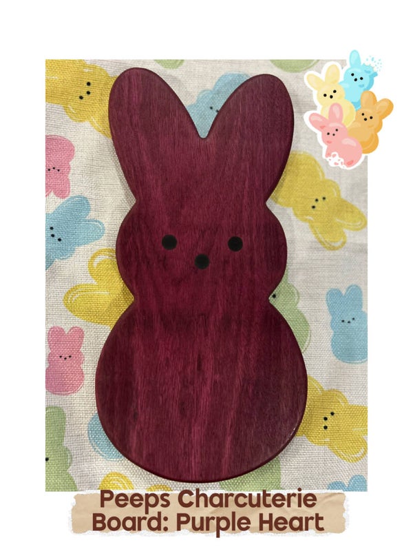 This adorable Peep-shaped charcuterie board is handcrafted from richly grained wood, showcasing beautiful natural swirls and depth in the wood. The classic bunny silhouette features rounded ears and a softly curved body, with three simple black inlaid dots forming the signature Peep-style eyes and nose for a clean, minimalist look.