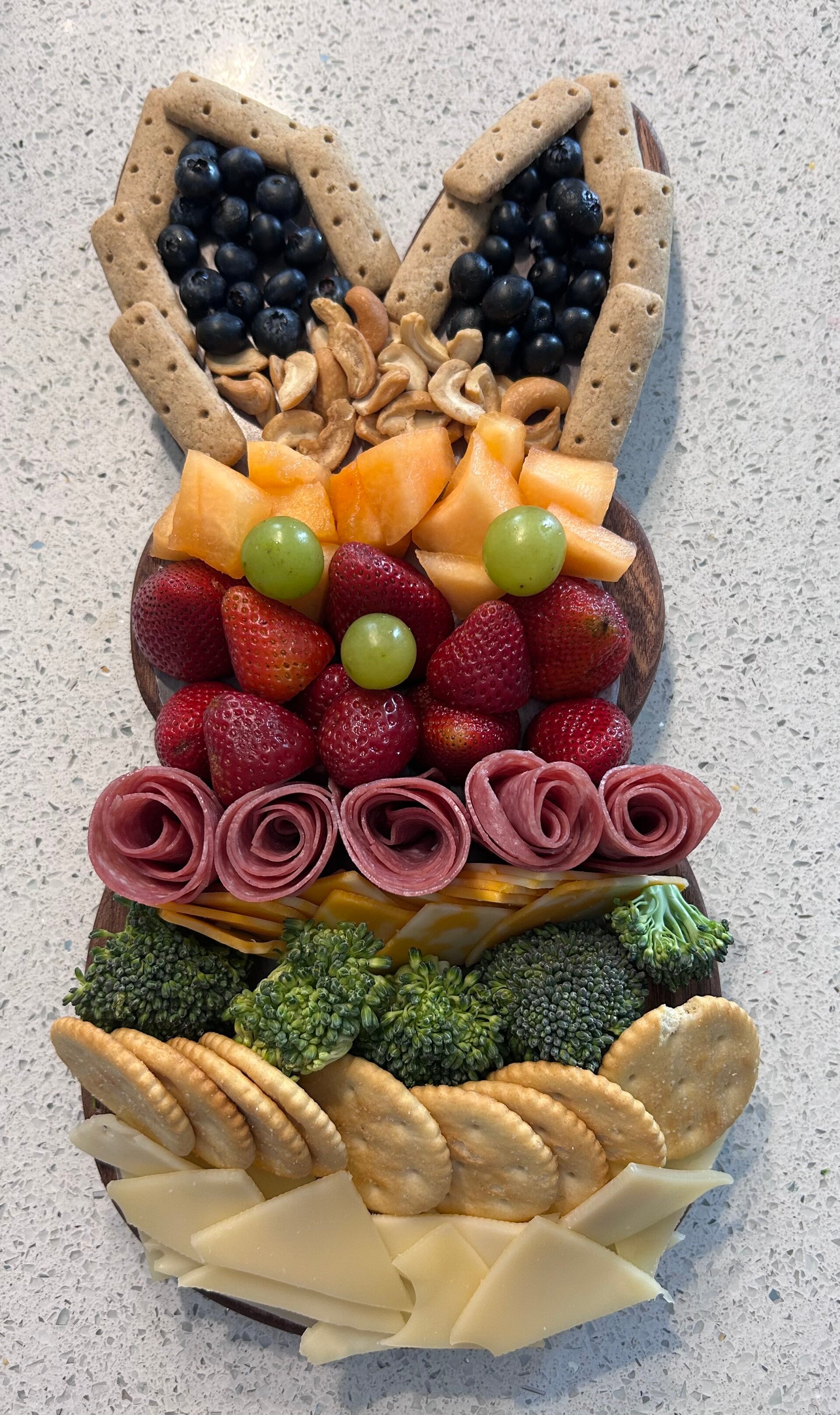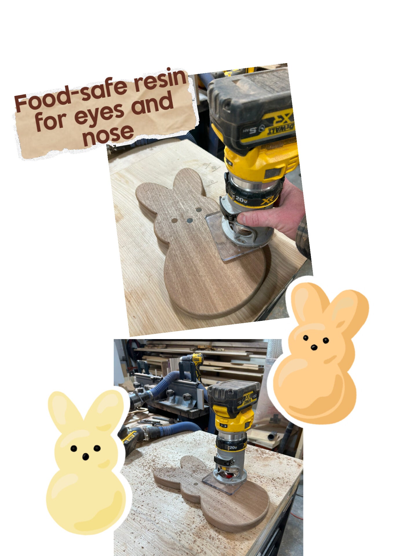 Food-safe resin eyes and nose. Food-safe mineral oil finish. Directions on how to care for Board included