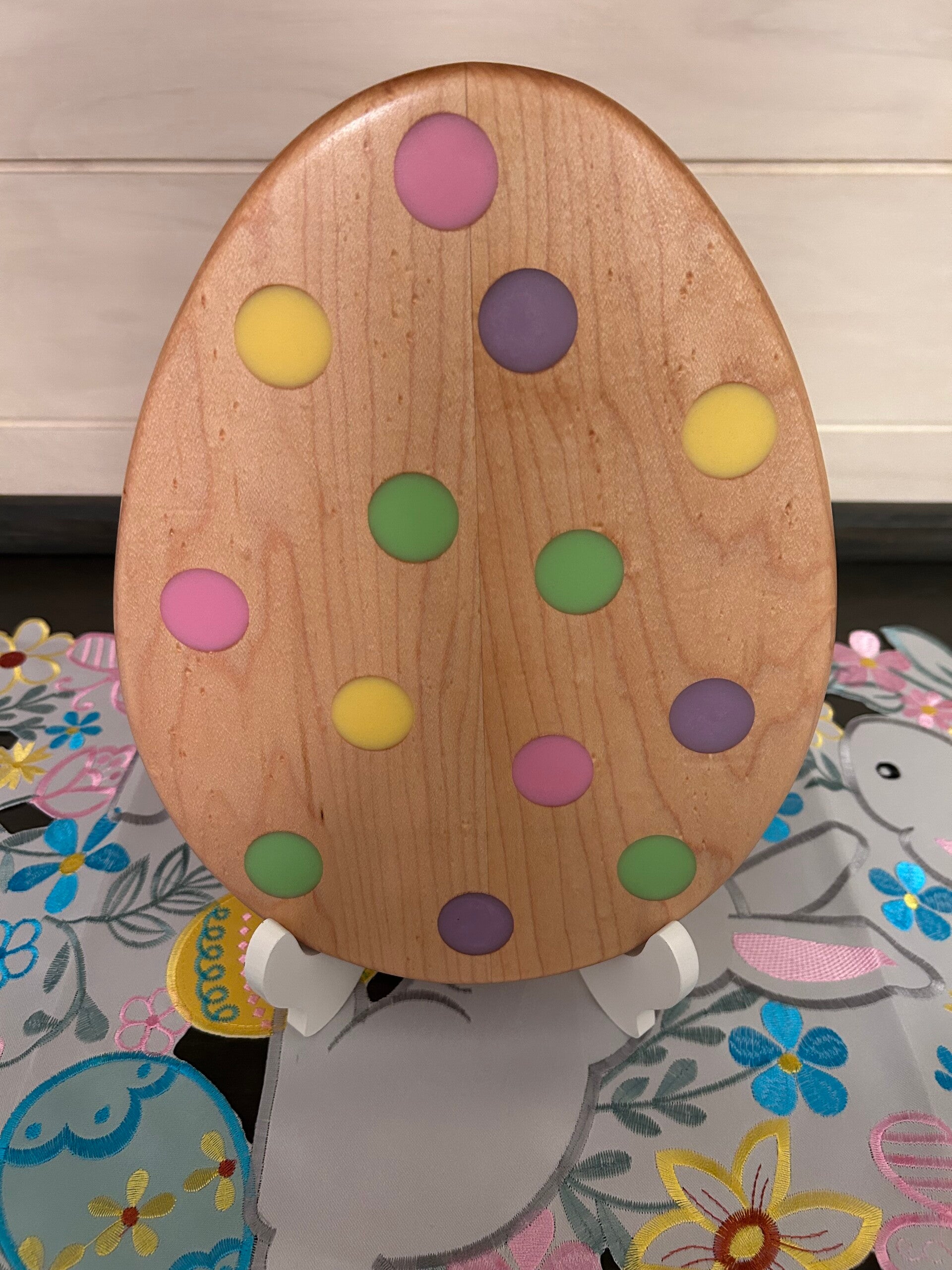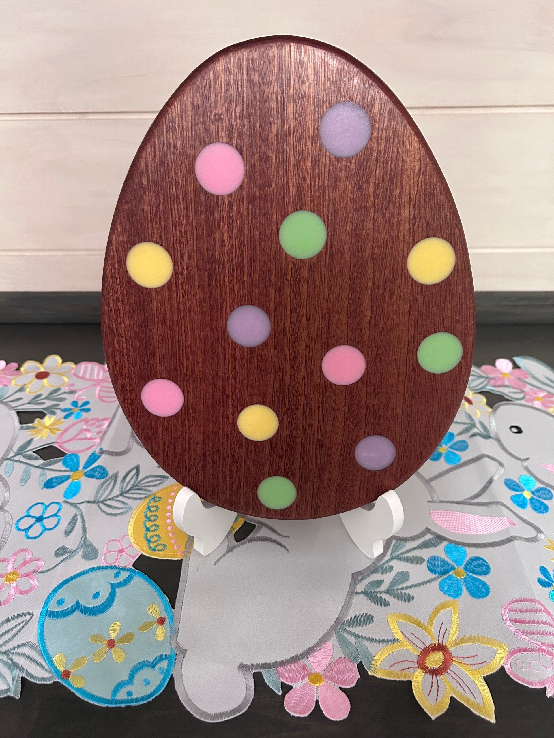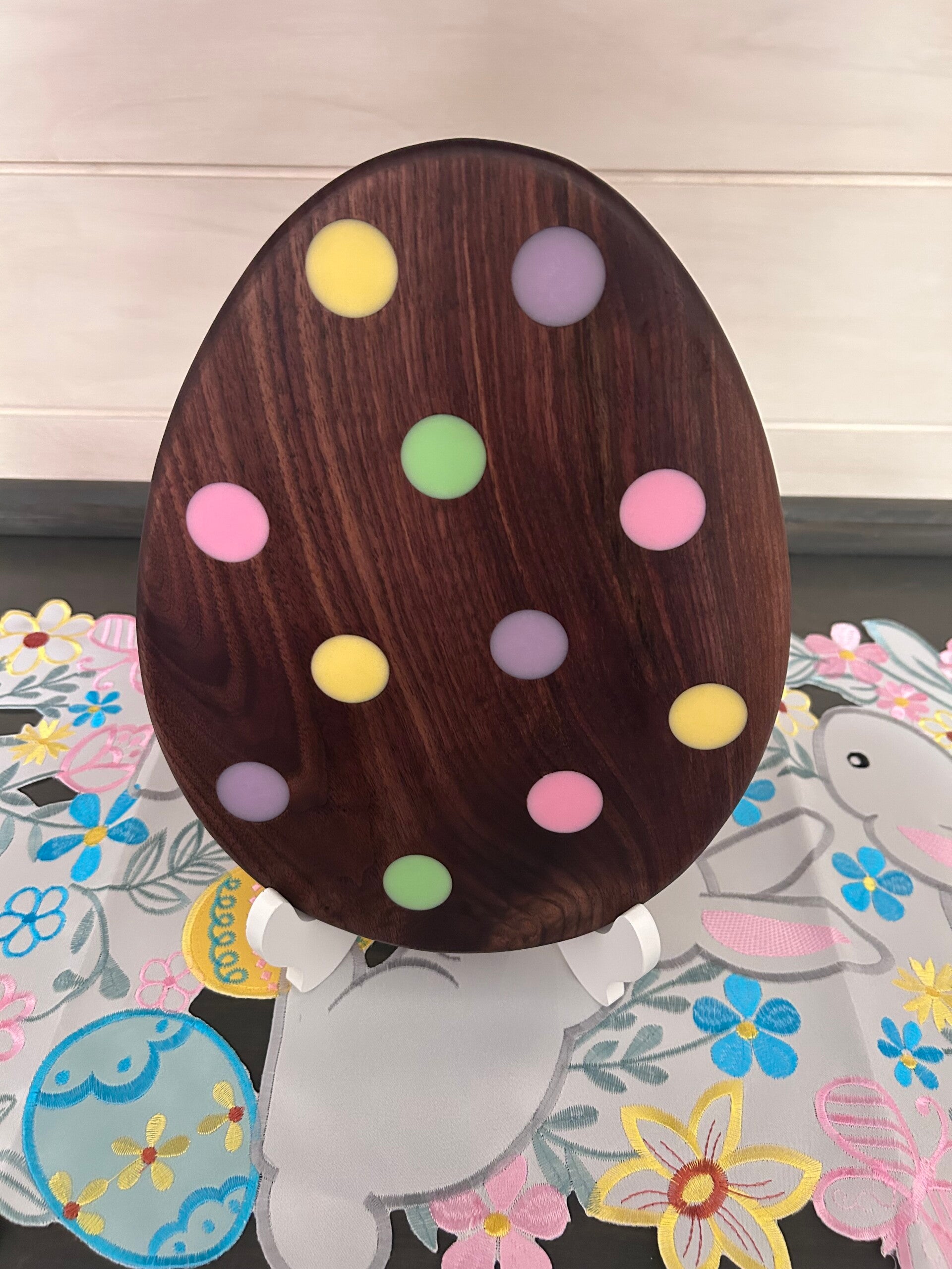 Scattered across the surface are vibrant pastel resin dots in cheerful shades of pink, yellow, purple, and green—each one carefully poured using food-safe resin. The colorful inlays create a whimsical, polka-dot egg design that instantly brings to mind Easter baskets, spring gatherings, and festive brunch tables.