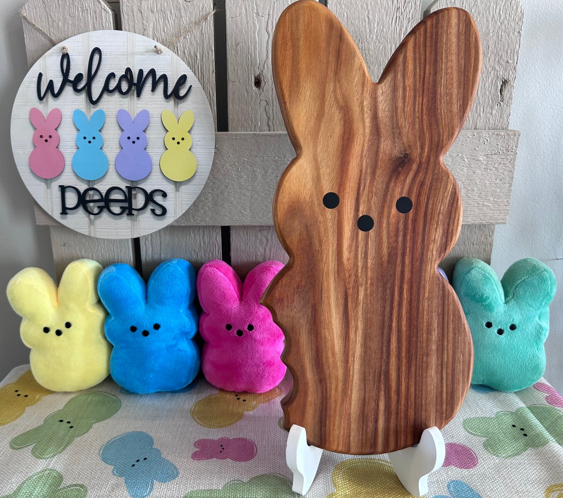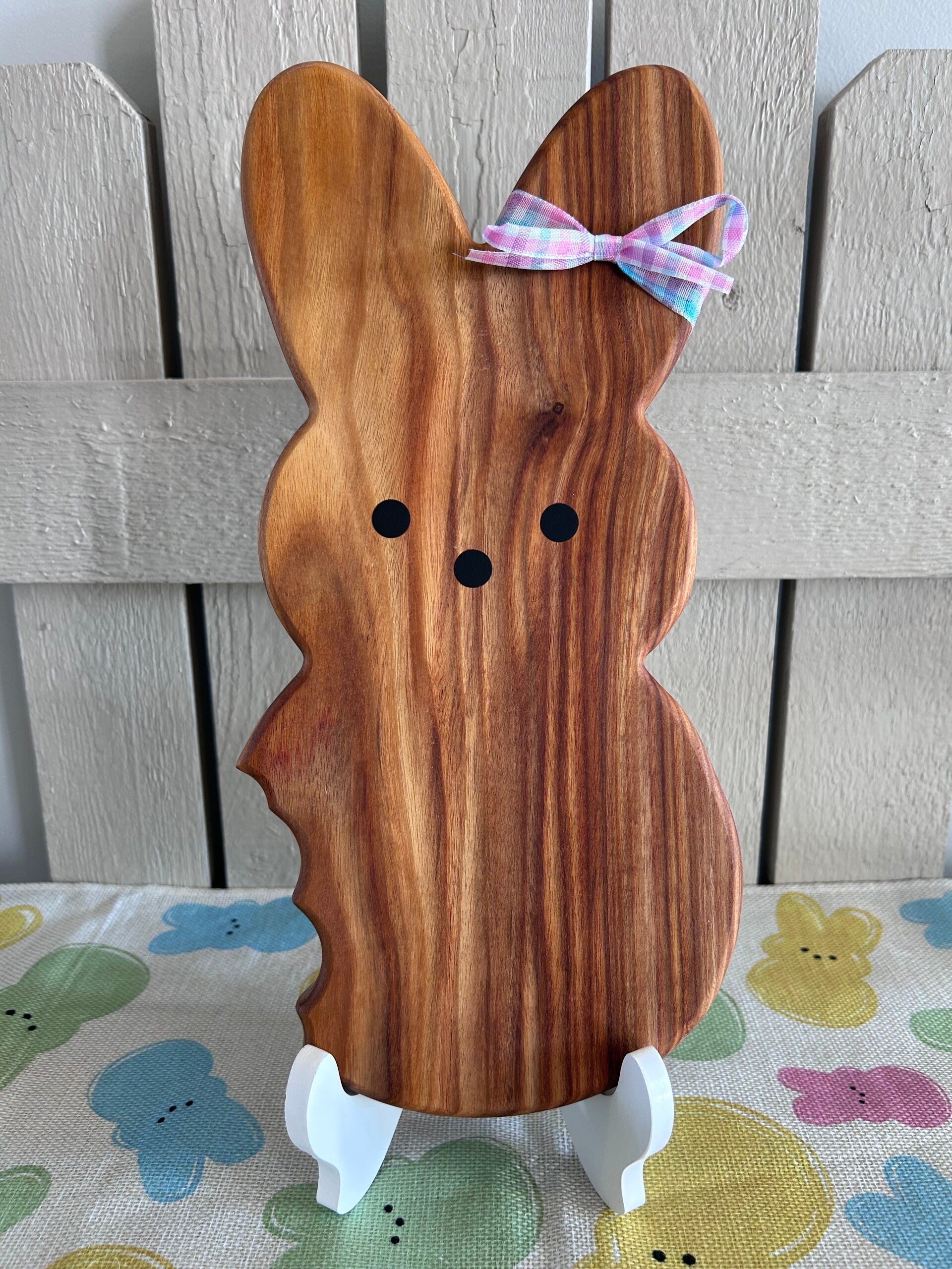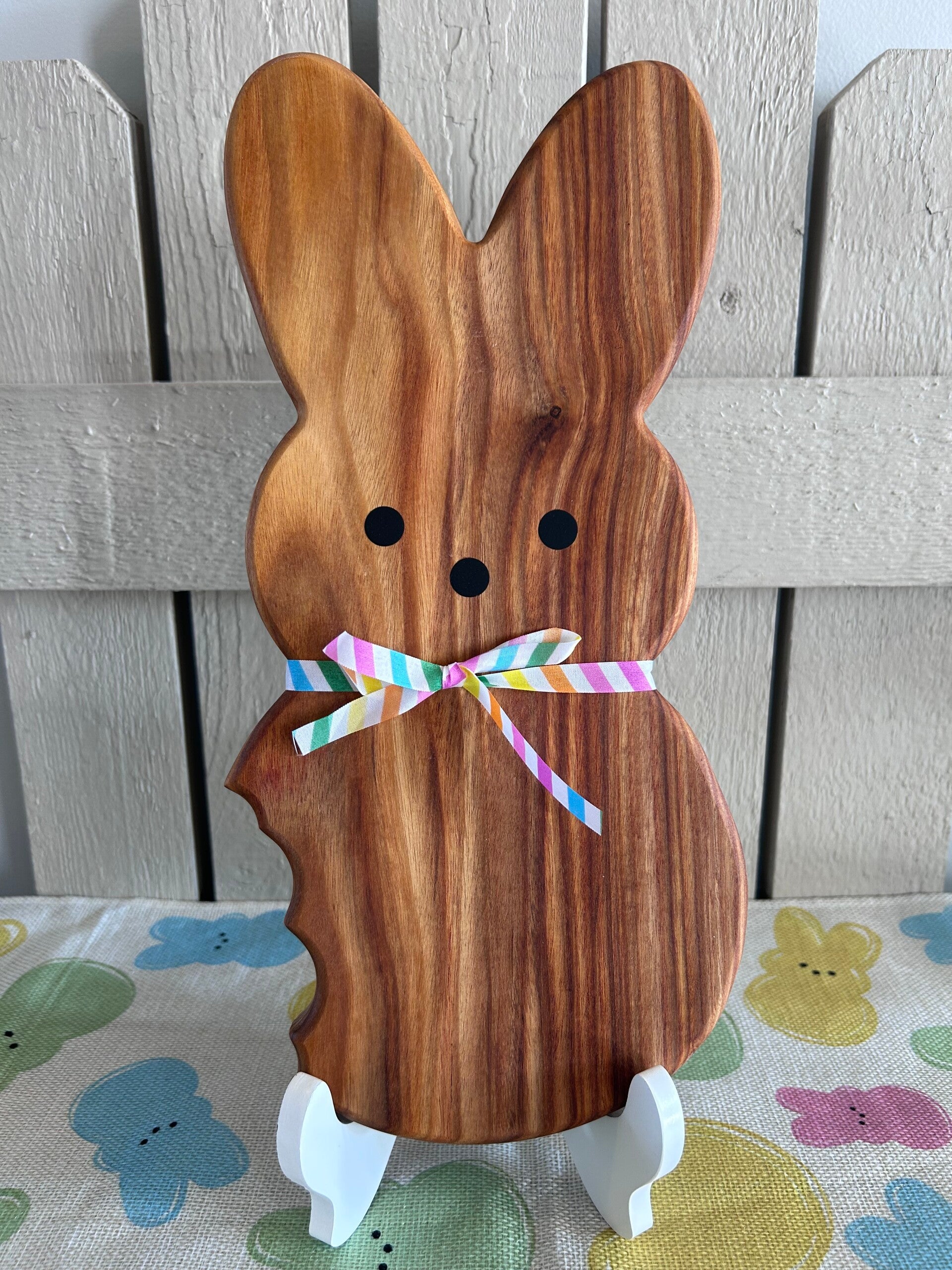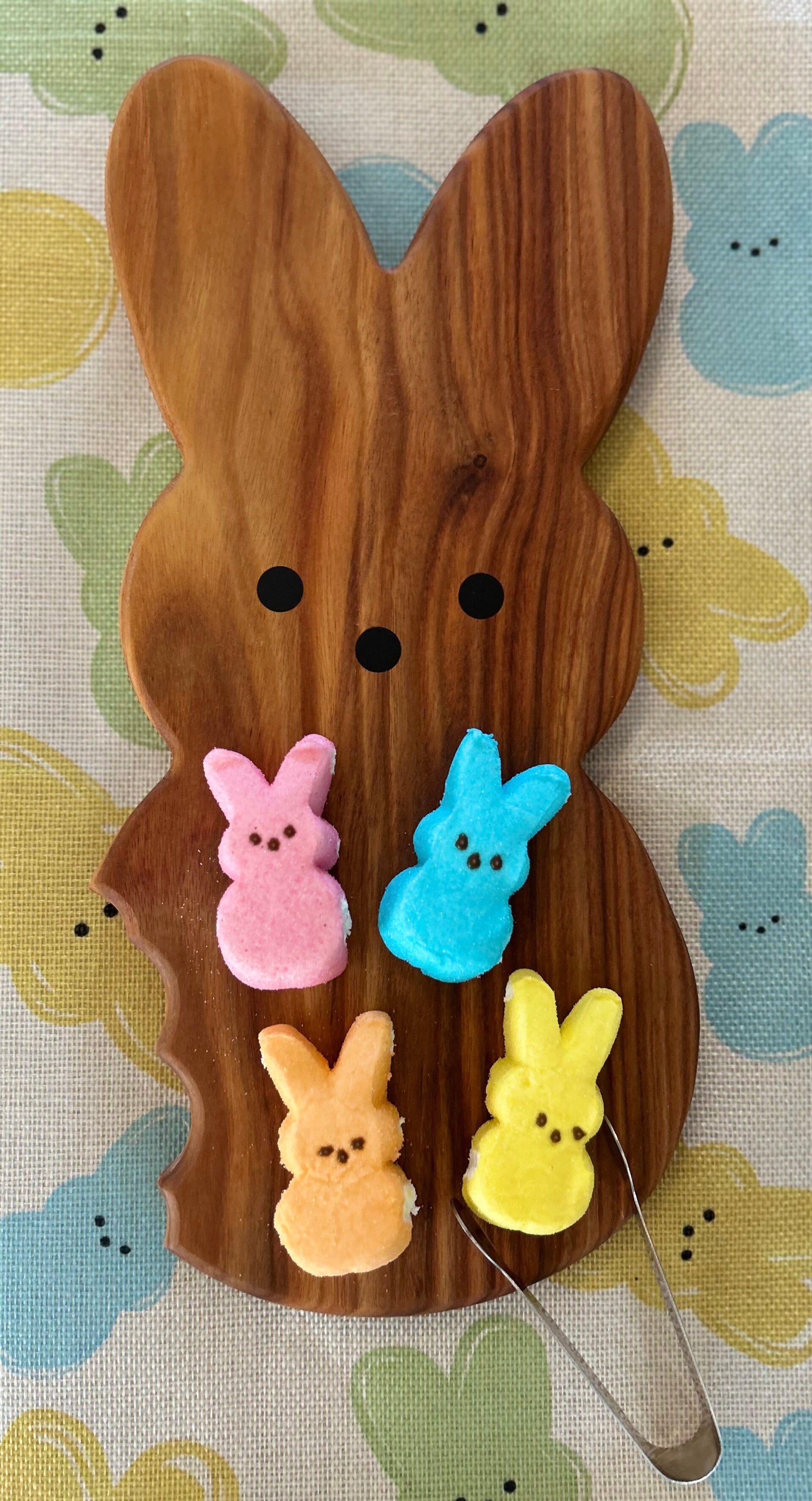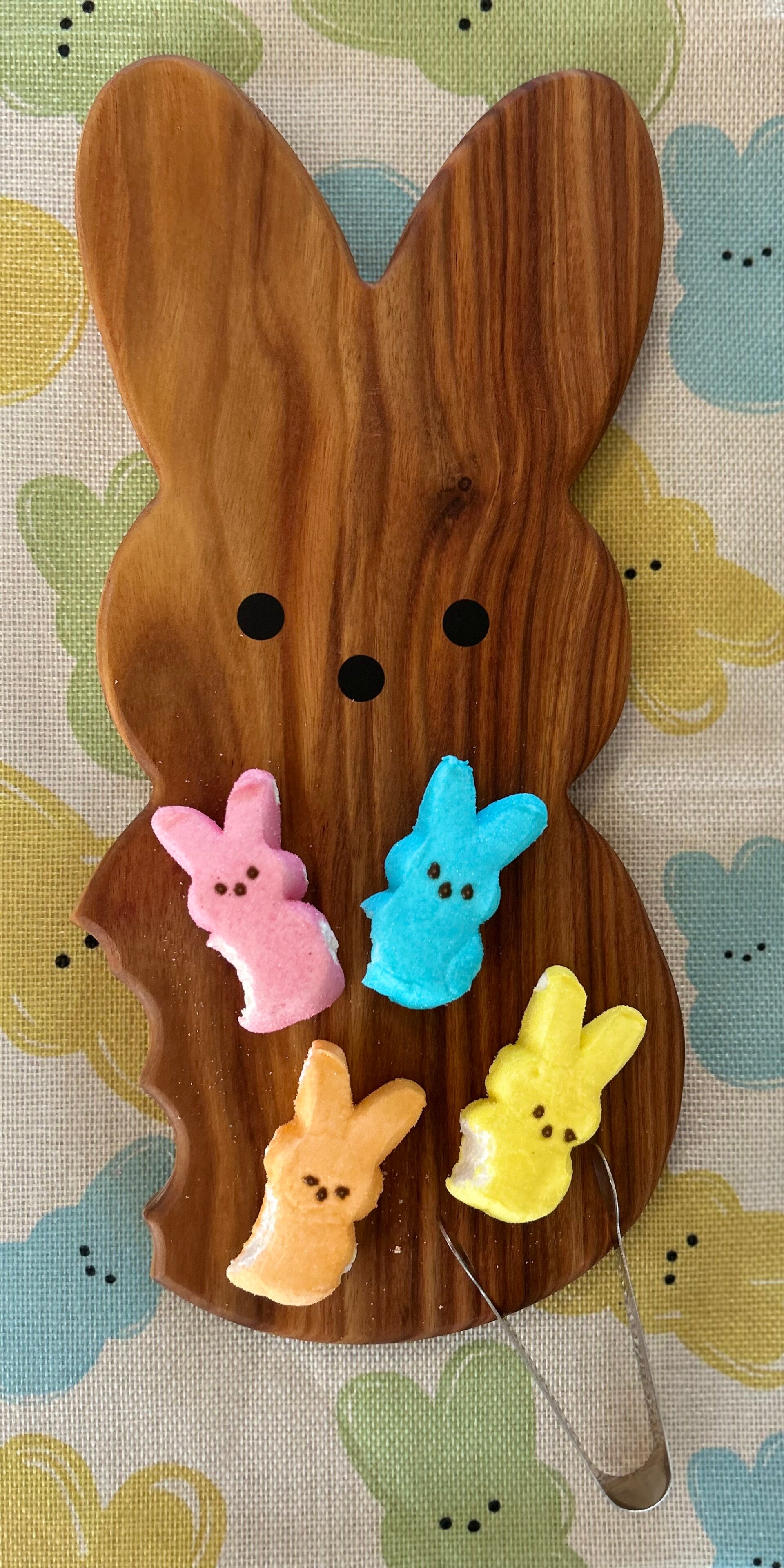This adorable Peep-shaped charcuterie board is handcrafted from richly grained wood, showcasing beautiful natural swirls and depth in the wood. The classic bunny silhouette features rounded ears and a softly curved body, with a little bite taken out of the side. It has three simple black inlaid dots forming the signature Peep-style eyes and nose for a clean, minimalist look.